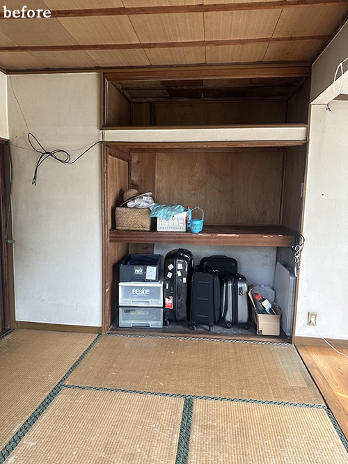 Before: 伝統的な押入れスタイル。中段・枕棚があり、布団以外の収納には工夫が必要でした。