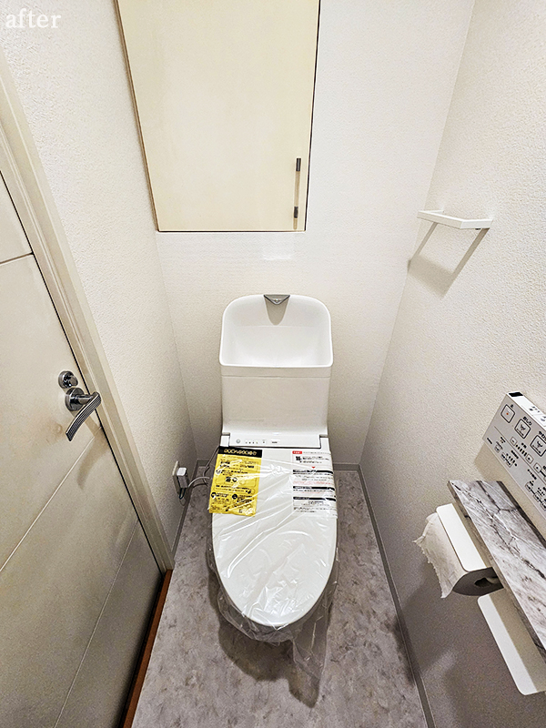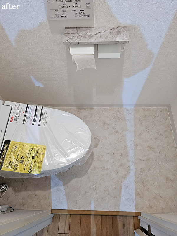 Toilet: 便器の交換に加え、ペーパーホルダーにはマーブル模様のカウンターを採用。